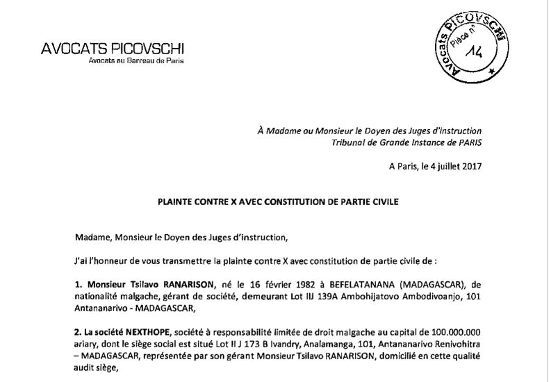 “Le 20 juillet 2015, Monsieur RANARISON portait plainte, entre les mains de Monsieur le Procureur Général de la Cour d’appel d’ANTANANARIVO (MADAGASCAR), à l’encontre de Monsieur ANDRIAMBOLOLO-NIVO, pour fraude, détournement et recel de biens sociaux, escroquerie, faux et usage de faux (Pièce n° 1).”
