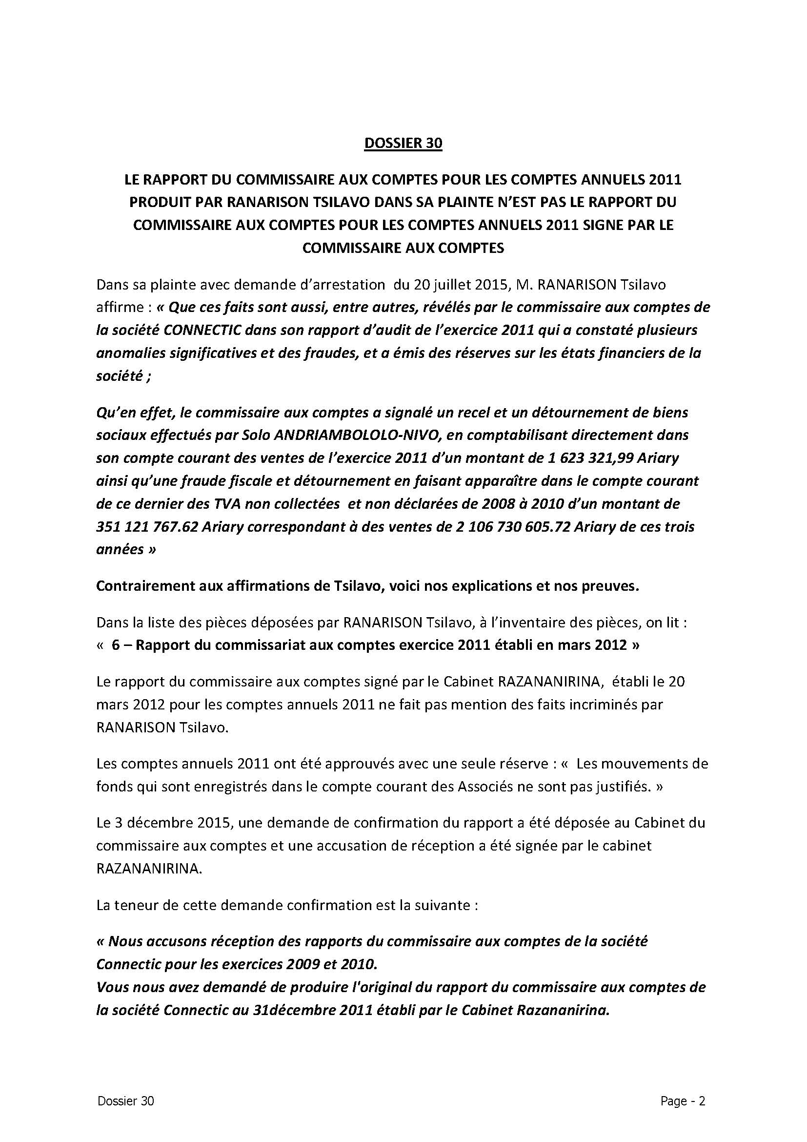 Dans sa plainte déposée en juillet 2015 contre Solo, gérant de CONNECTIC, Ranarison Tsilavo affirme que le rapport du commissaire aux comptes pour 2011, signé par le Cabinet Razananirina, contient des révélations graves : anomalies significatives, fraudes et détournements de biens sociaux.