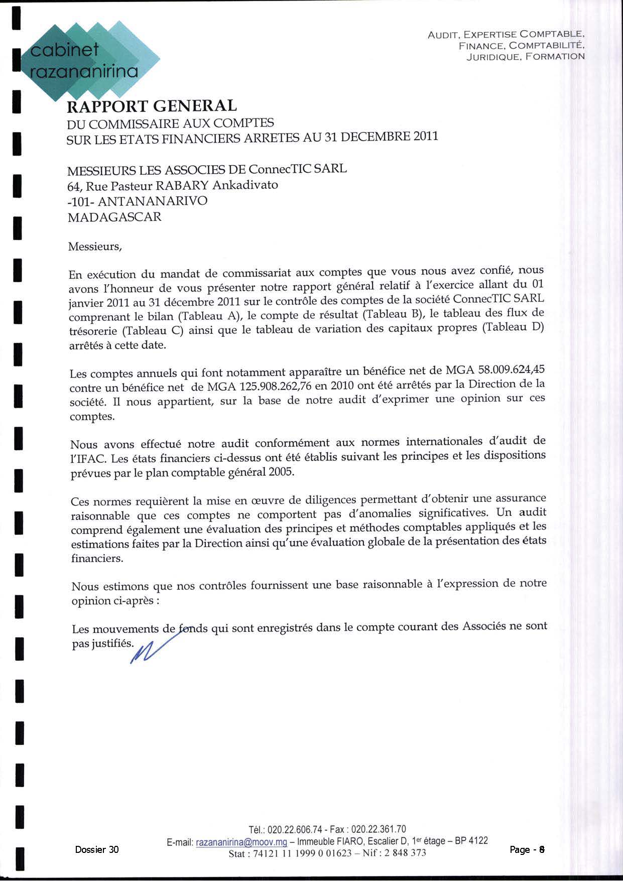Le rapport officiel, daté du 20 mars 2012, analyse les comptes annuels de CONNECTIC pour l’exercice 2011. Contrairement aux affirmations de Ranarison Tsilavo :